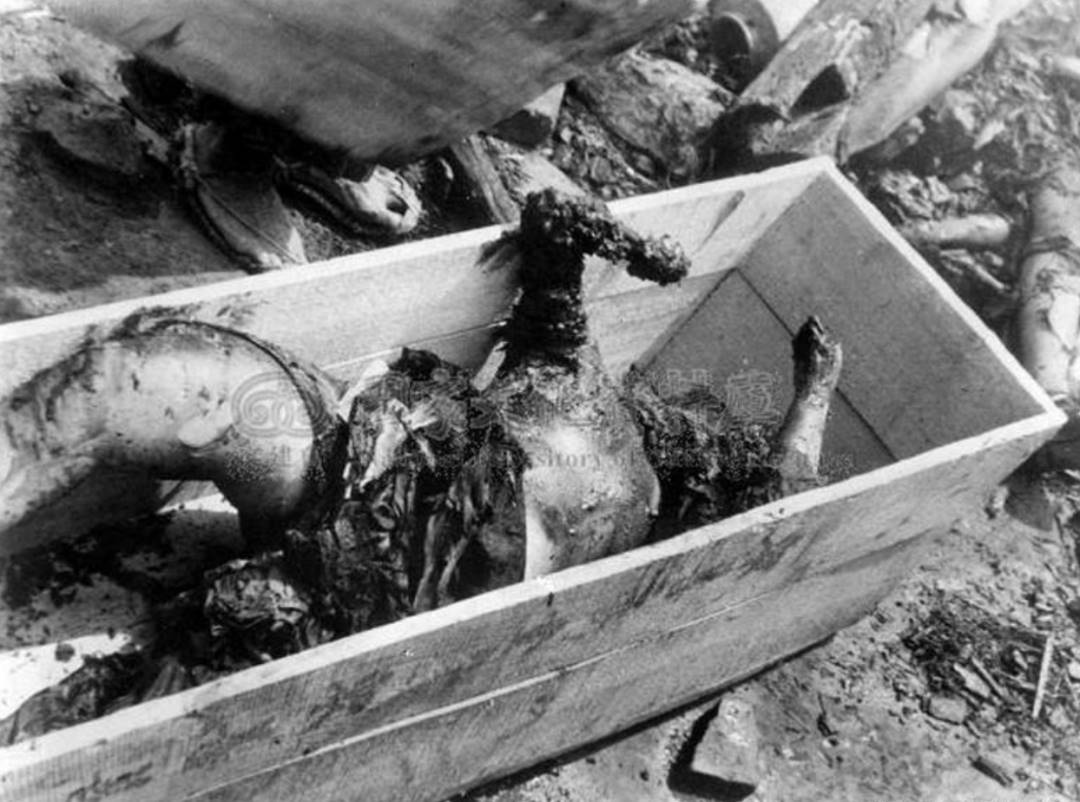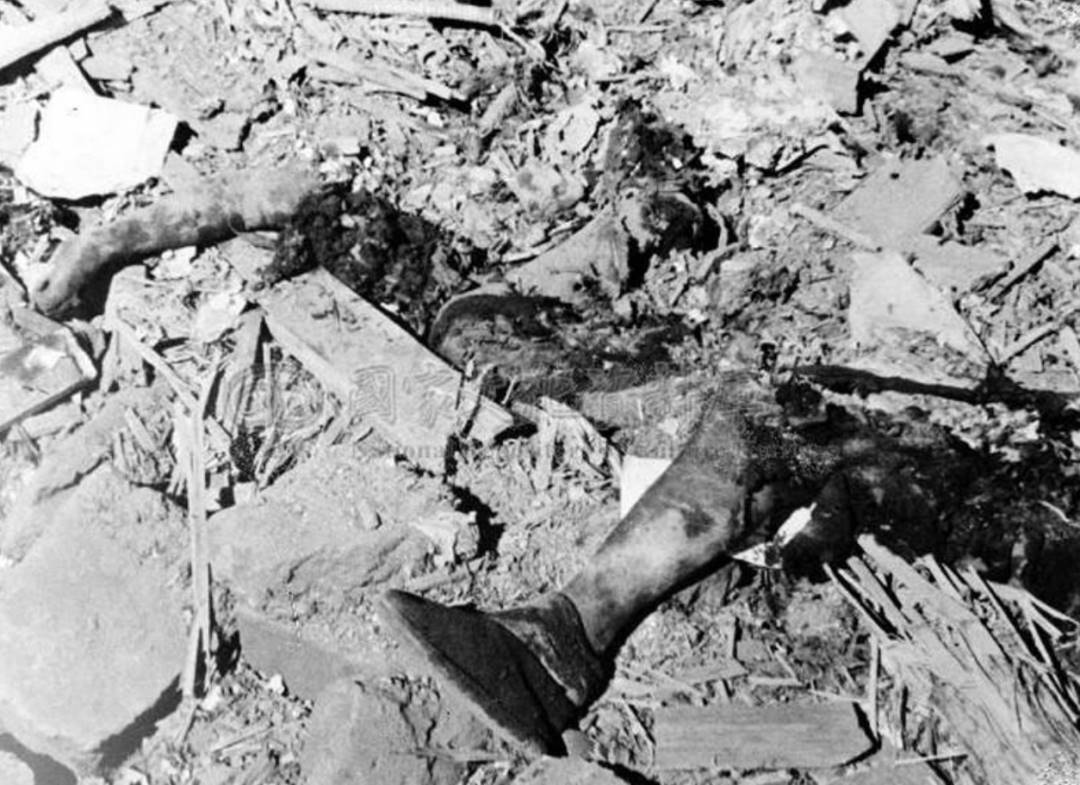 1938年,被日本飛機投彈炸死的武漢市民,右手和頭部都已燒焦。