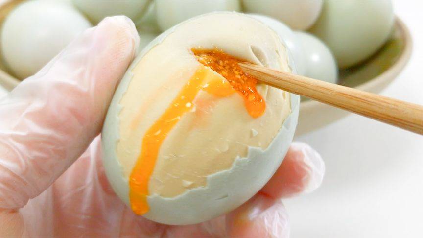4、腌制的時間滿28天后,可以拿出一個腌好的鹽蛋煮熟后看看,又有油又起沙,同時咸淡合適,那就說明腌制好了。
