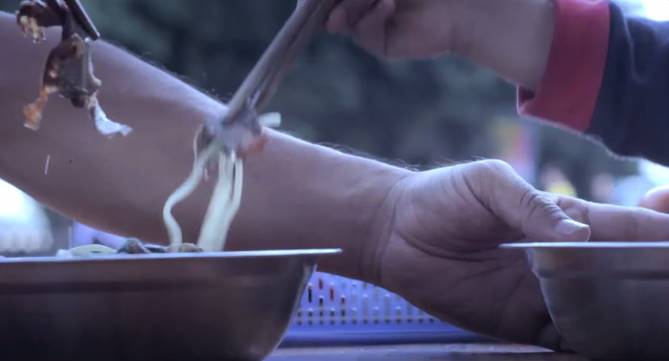 当这对父子吃完面时,小男孩拿出早上吃剩的装馒头的袋子,把一盘未动的牛肉给装起来,可能是作为明天的储备。随后搀着父亲一步一步,往回家的方向渐渐走远。