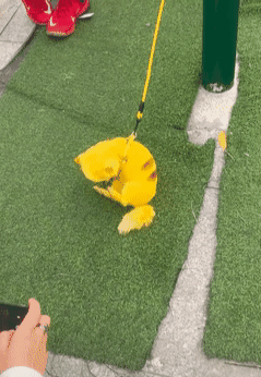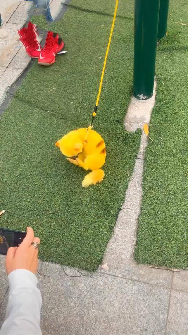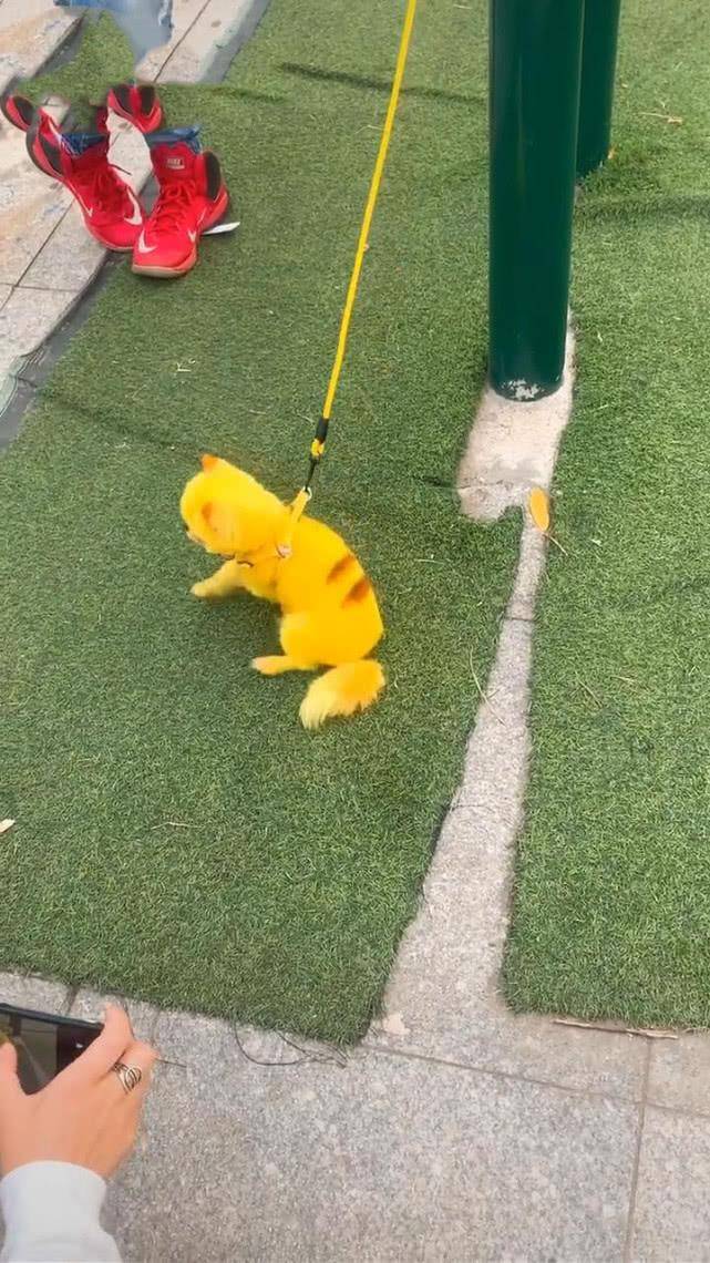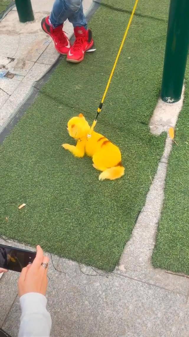 原来这并不是什么特别的玩意儿,而是一条狗狗,由于它的主人比较喜欢黄颜色,所以不仅是牵引绳,就连狗子的颜色也给染成了黄色,看上去特别的吸睛。