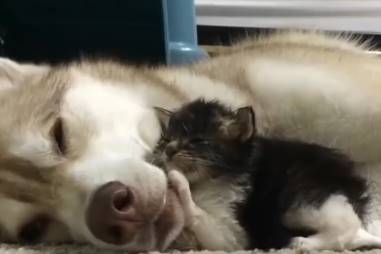 由于L的照顾,小R的状况得到好转,逐渐适应了新的环境,也慢慢能够正常进食。夜以继日的陪伴和相处使这只猫咪和哈士奇成了形影不离的好朋友,或者说是最亲密的家人。