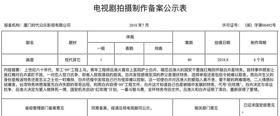《畫眉》又名《我的雙面女友》,故事的男女主角分別是青年工程師呂漁火和醫院清純小護士白卉,兩人一見鐘情,然而卻意外卷入了諜戰的漩渦,白卉被迫暗中成為了特務,在經歷了一番殊死搏斗之后,兩人重新走到了一起。