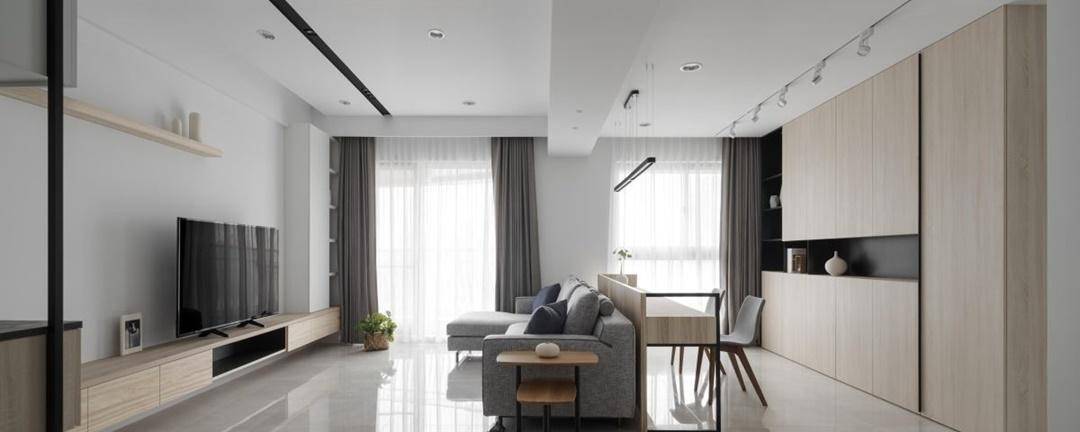 客廳電視墻揮別繁瑣的設計,僅以一道木質擱板與懸浮柜自玄關遞進,創造不斷延展的視覺感受。