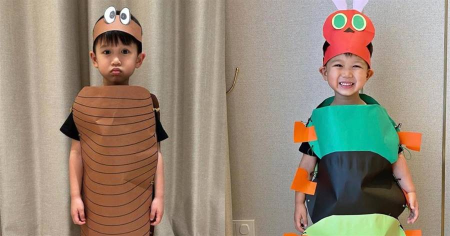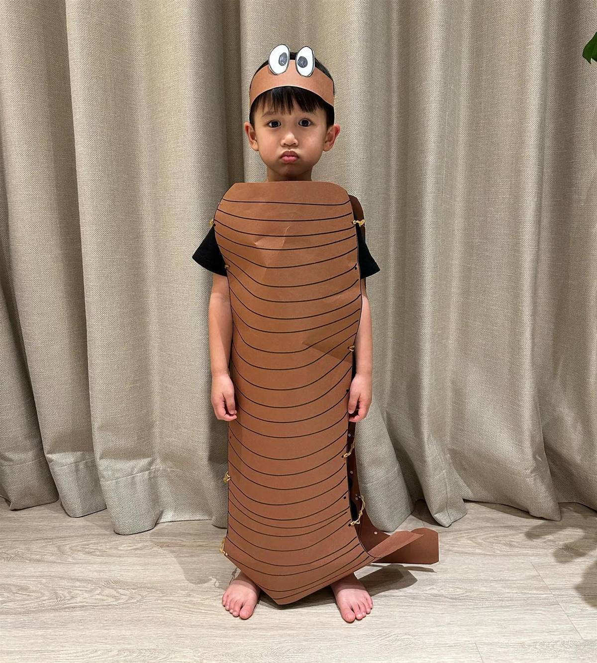 照片中,3歲的奕霖小朋友穿著媽媽給他做的「蚯蚓裝」拍照,只見他嘟著嘴巴,臉蛋鼓鼓的,看著像在生胖氣的小朋友一樣,但還是那麼帥氣,那麼可愛呀。胡杏兒看到兒子這副表情一開始還不知道是什麼緣由,聽奕霖解釋后才明白,原來是因為他「不滿意」,他說蚯蚓是沒有手的,但自己雙手都露在外面了。