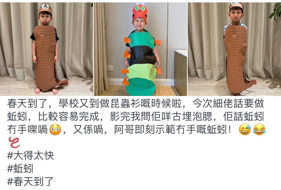 胡杏兒在社交平台曬出大兒子奕霆和二兒子奕霖的萌照,并配文「春天到了,學校又到做昆蟲衫的時候啦,這次弟弟說要做蚯蚓,比較容易完成,拍完我問他為什麼鼓著腮幫子,他說蚯蚓沒手的,又系窩,阿哥即刻示范沒手的蚯蚓!」